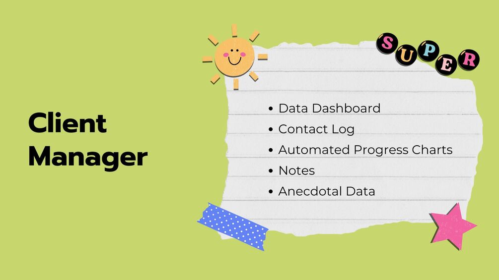 Automated progress charts, data sheets (see the dashboard for links), session notes, data collection, and more!