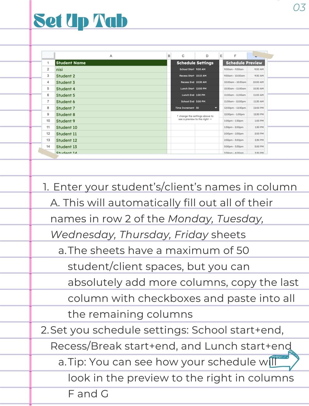 - Customizable Setup Tab: Easily input student names and set up your school or work day with precise start times, recess, and lunch periods.