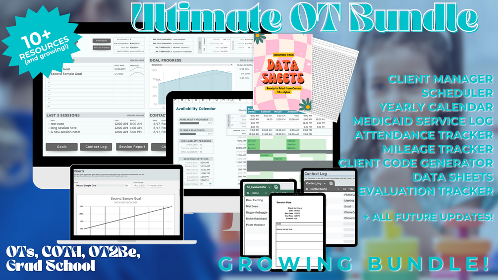Discover a transformative toolkit crafted exclusively for Occupational Therapists. Our Ultimate OT Productivity Bundle is a comprehensive collection of digital templates designed to streamline your administrative tasks, save you time, and elevate your practice. From progress tracking to attendance management, yearly planning to caseload organization, each template is tailored to meet the specific needs of OTs. What's even better? It's a growing bundle – your one-time purchase ensures ongoing access to new templates added to our store, keeping you at the forefront of time-saving innovation. Embrace digital convenience, seamless integration, and a new era of efficiency with the Ultimate OT Productivity Bundle. Elevate your practice today! 🚀